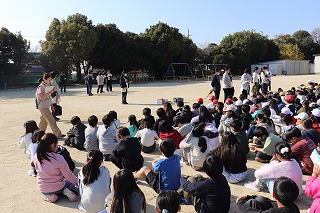 訓練放送が大放課中に流れ、児童は教室、廊下、運動場など