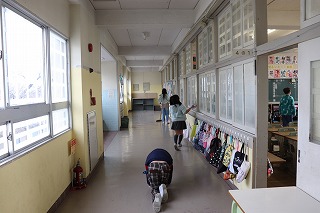 訓練放送が大放課中に流れ、児童は教室、廊下、運動場など