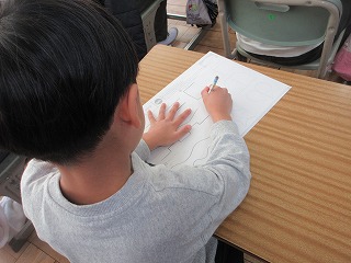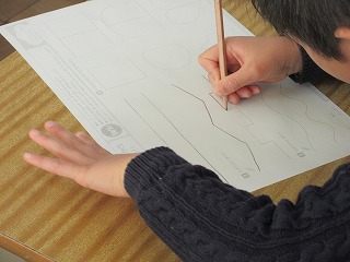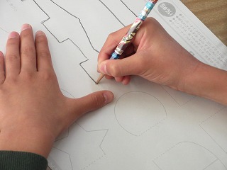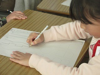 今日お友達が持っているのは、いつもの「えんぴつ」。だけど、とっても緊張感をもって線を引く練習ができました。
