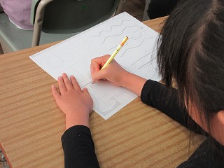えんぴつで引ける線は、とにかく「たて線」のみ!プリントには折れ曲がったり、直角に曲がった線があり、その上をなぞるにはどうすればええかな?